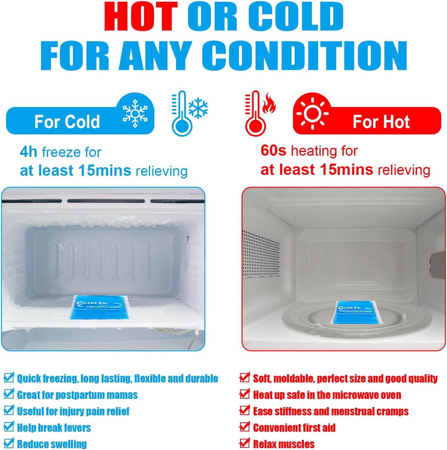 - HOT AND COLD THERAPY: The flexible ice pack can be used as a cold or warm compress. Just stick them in the microwave 20 seconds to reach a comfortable temperature. Or freeze in the freezer for at least 2 hours to provide soothing cold therapy.