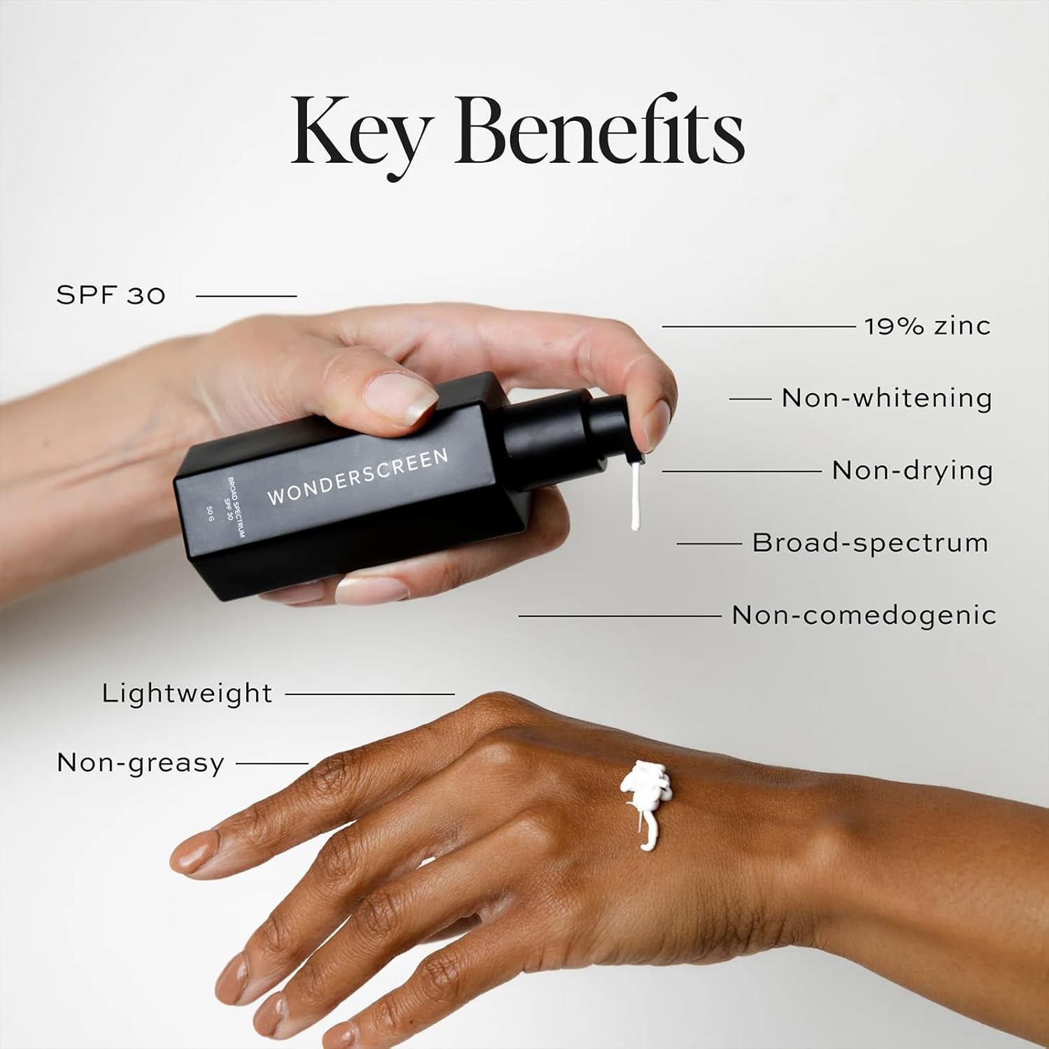 - BROAD-SPECTRUM SPF 30: Wonderscreen is a non-greasy, non-whitening, lightweight formula that won't dry out your skin. Designed to scatter UVA and UVB rays, the zinc in our travel sunscreen acts as a barrier and gives your skin the sun protection it needs.