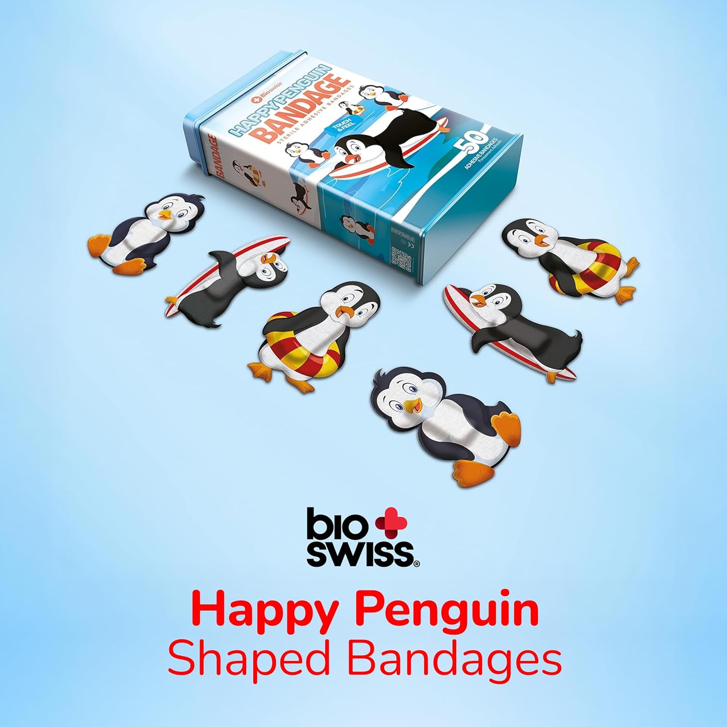 BioSwiss Kids Bandages, Penguin Shaped Self Adhesive Bandage Set, Latex Free, Sterile Wound Care, 50 Count