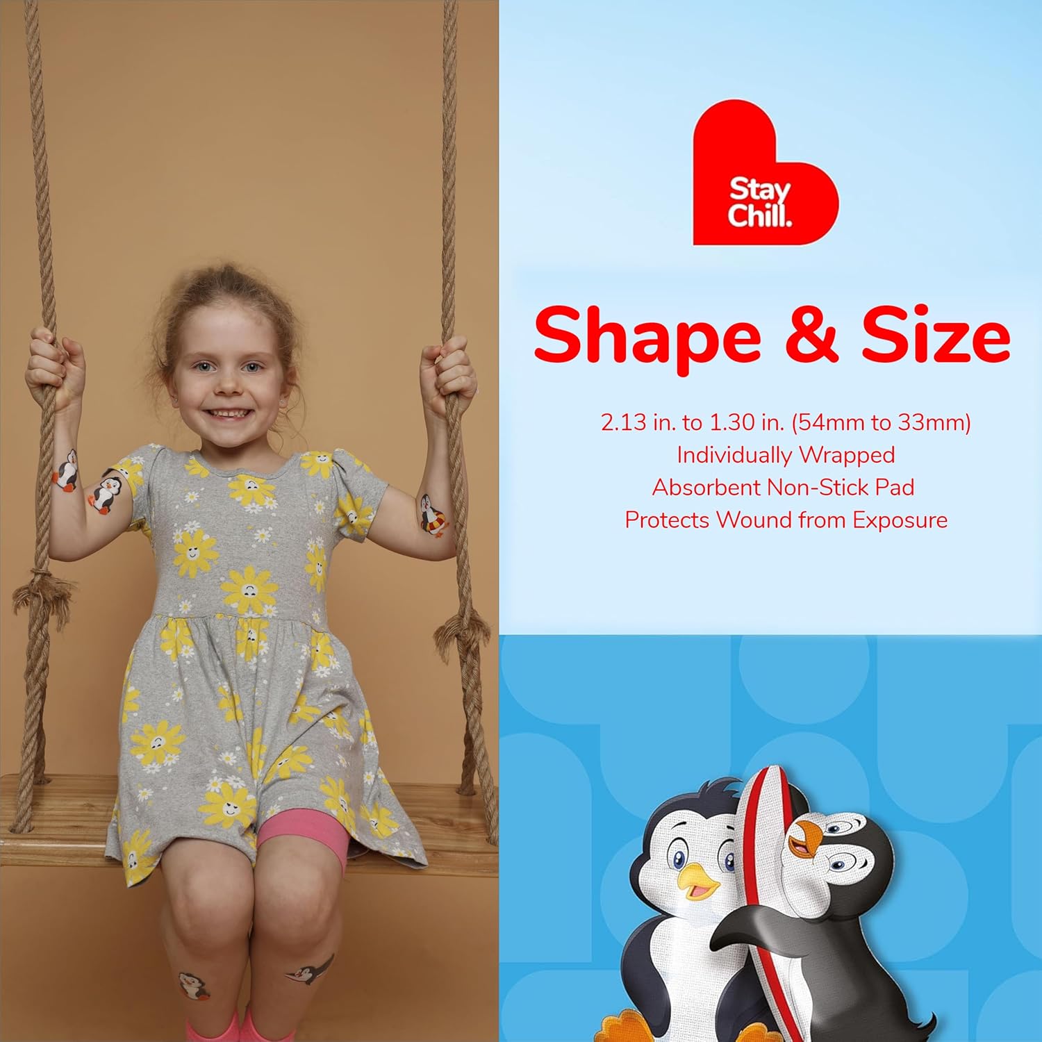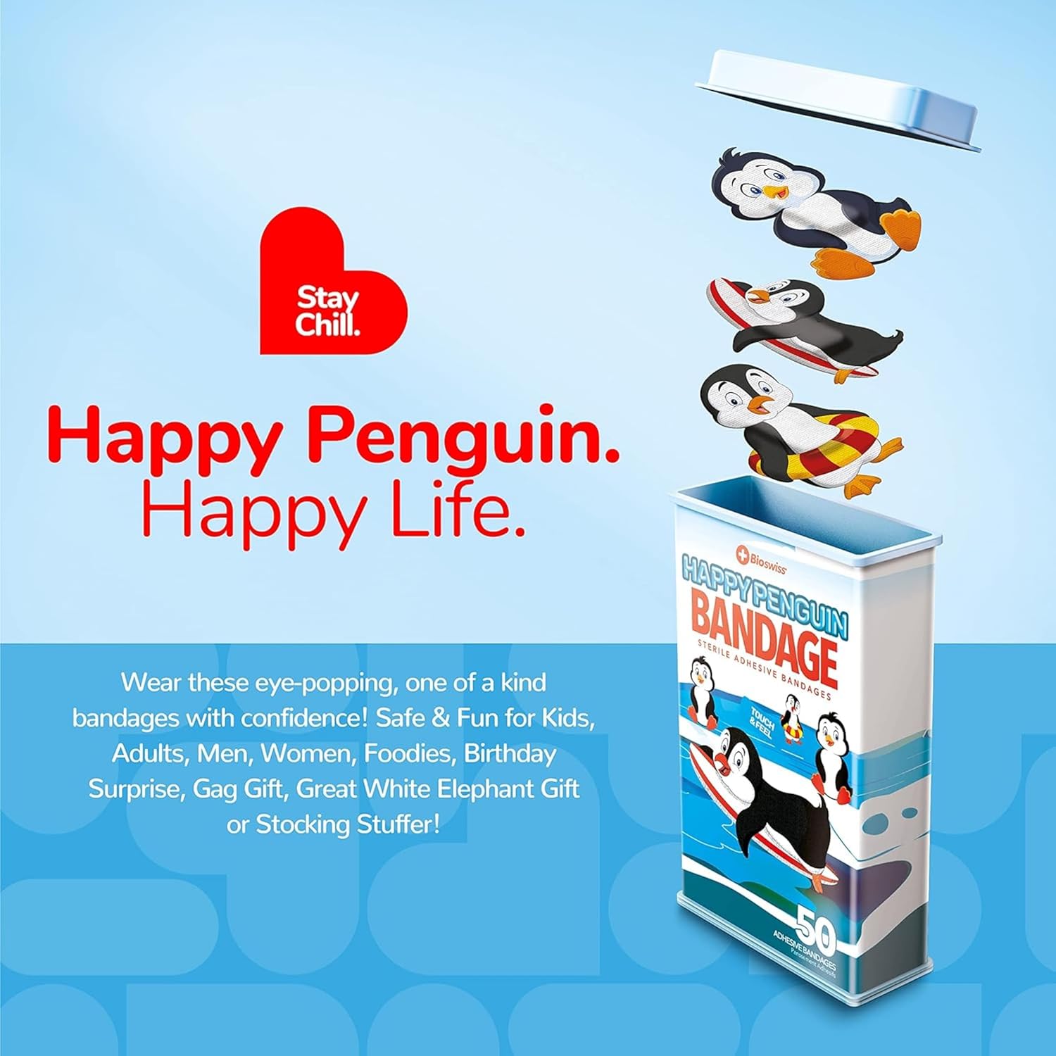 - 50 PENGUIN KIDS BANDAGES: Fun penguin-shaped adhesive bandages tin helps protect cuts, scrapes, and minor wounds while making healing less stressful for children; bandages come in 3 assorted styles