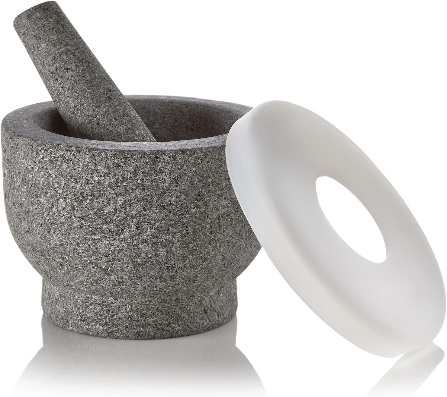 - EASY TO CLEAN: Mortar and pestle are hand wash only. To keep the integrity of the granite, rinse immediately after use to minimize staining. Depending on how they were used, clean with a dishcloth or an abrasive sponge to remove food particles. Rinse thoroughly and dry with a cloth before storing. The silicone lid is dishwasher safe and won't break or crack easily