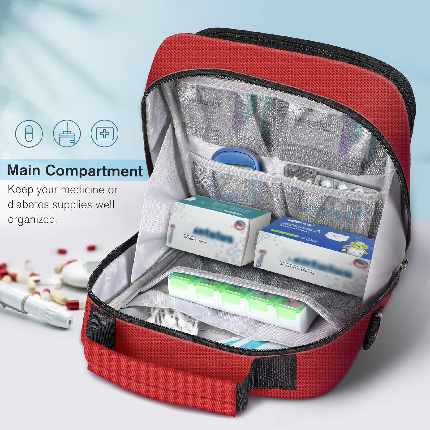 - 【Travel Friendly】Come with portable hand strap and detachable & adjustable shoulder strap, prepared for all situations and go anywhere without worry, perfectly portable and convenient. With premium YKK zipper, this compact medicine carrying case is durable and secure for quickly access. Reflective strip make you noticeable when at night.