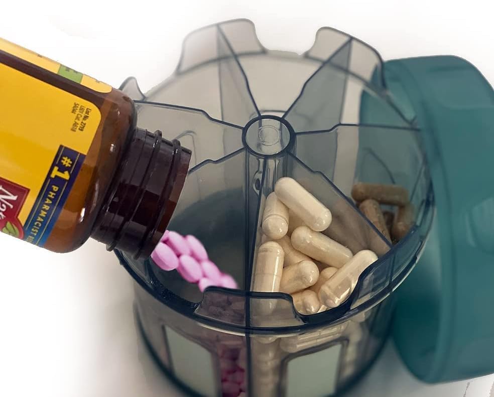 - 【Easy to Use】TPU rubberized lid rotates with ease to select compartments, loading the compartments with vitamin & pills is easy by peeling the flexible lid.