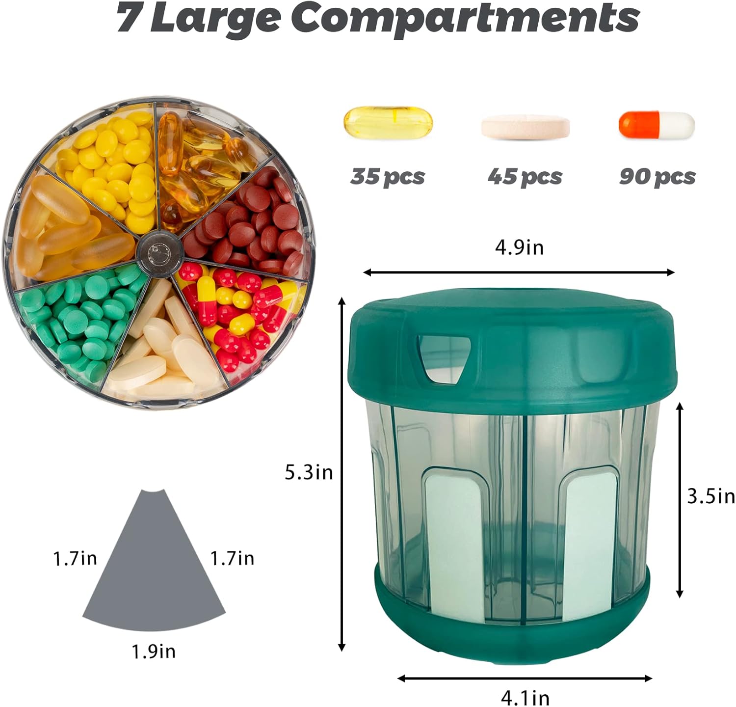 - 【Space Saver】One convenient pill dispenser with 7 large compartments. Fit prescription and over the counter pills large and small, providing you with 30 days medications and supplements.