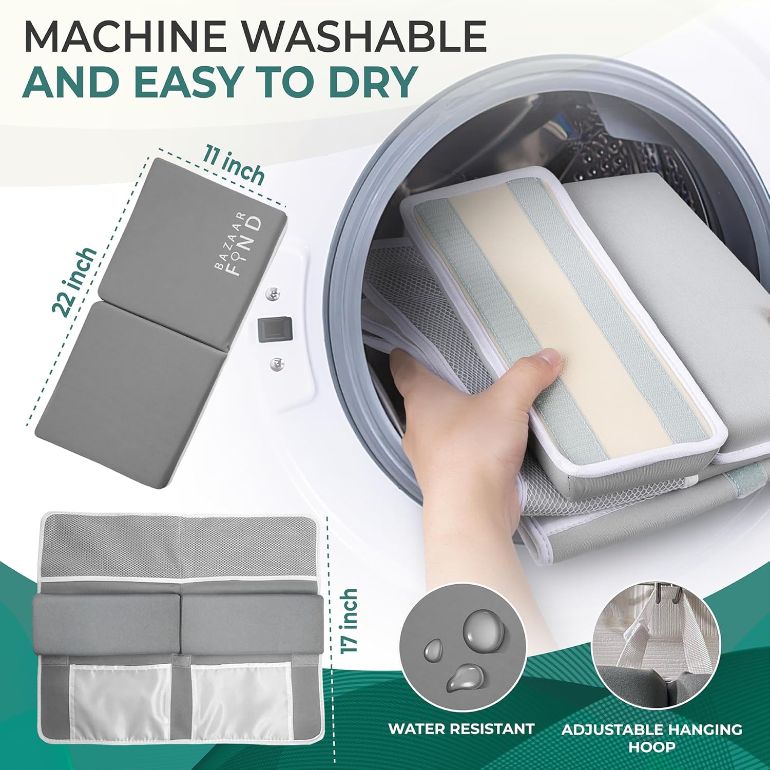 - MACHINE WASHABLE AND EASY TO DRY - Our kneeler and elbow rest bath pads are covered in a water-resistant material that allows for easy cleaning with a damp cloth or in the washer. Once bath time is done, air dry both pads with the adjustable hanging hook or use the built-in velcro design on the elbow rest.
