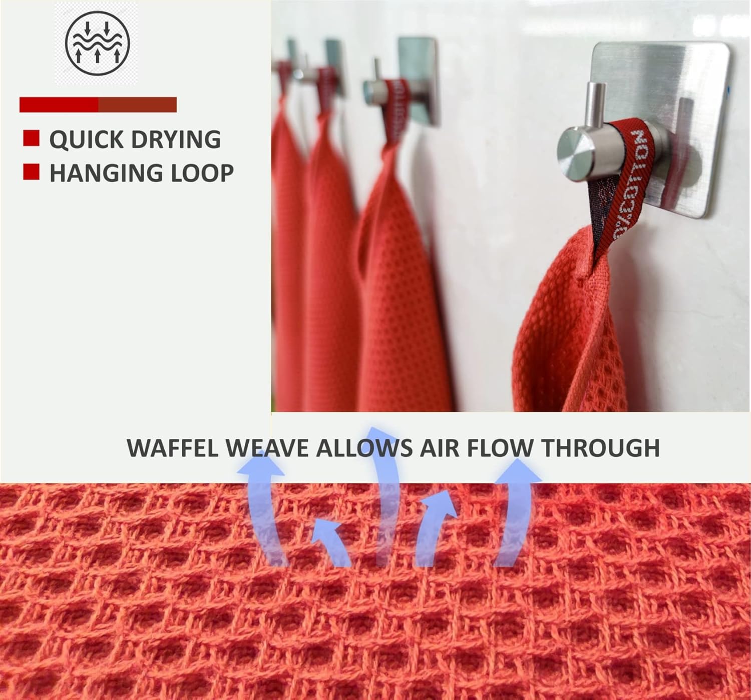 - 【EXTRA SOFT and SUPER ABSORBENT】The premium cotton material and the unique waffle weave design make sure these kitchen dish towels are breathable, extra soft and super absorbent. The no-scratch feature provide utmost protection to your valuables. These fluffy kitchen towels soak up much more water than cheap paper towels. They will remove any liquids in no time with simple wipes