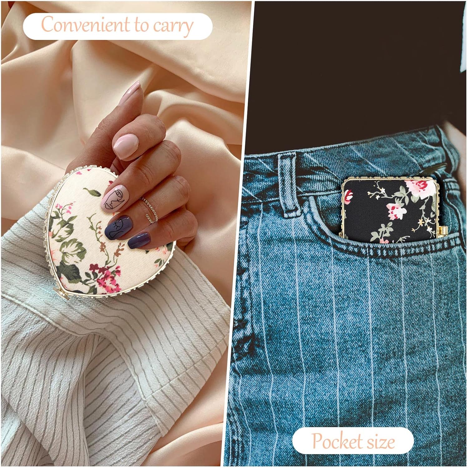 - Suitable Size: pocket mirror of different shapes has different sizes; The round shape is approx. 3.1 x 2.7 x 0.6 inches, the rectangle is approx. 2.8 x 2.6 x 0.6 inches, the heart shape is approx. 2.7 x 3.1 x 0.6 inches, and the oval is approx. 3 x 2.4 x 0.6 inches