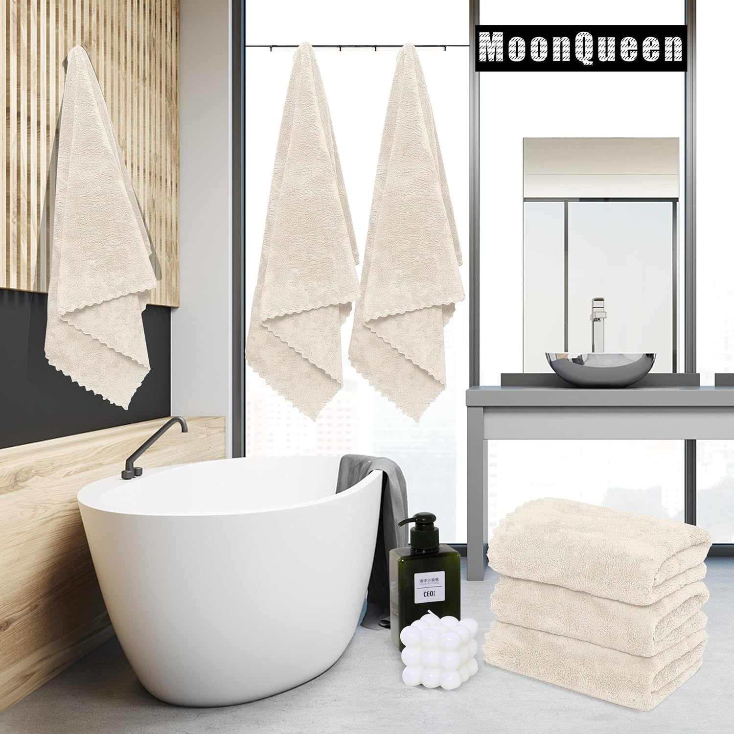 MOONQUEEN 2 Pack Premium Bath Towel Set - Quick Drying - Microfiber Coral Velvet Highly Absorbent Towels - Multipurpose Use as Bath Fitness, Bathroom, Shower, Sports, Yoga Towel (Cream)