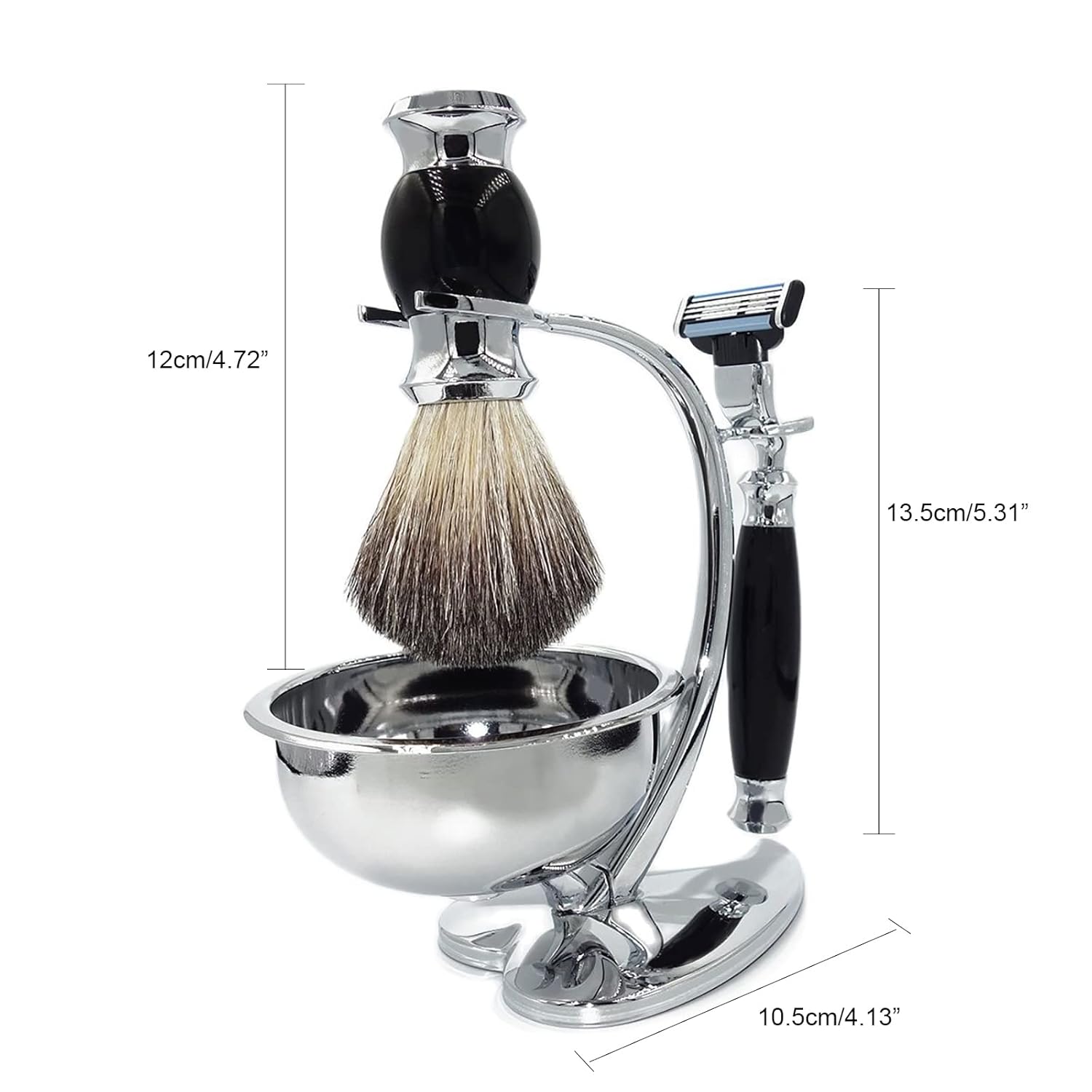 - Ideal Shaving Kit:4 in 1 wet shave kit include Mach 3 razor compatible with Gillette Mach 3 blade,1 piece 3-layer blade,badger hair Lather brush,soap bowl and heart shape stand holder.