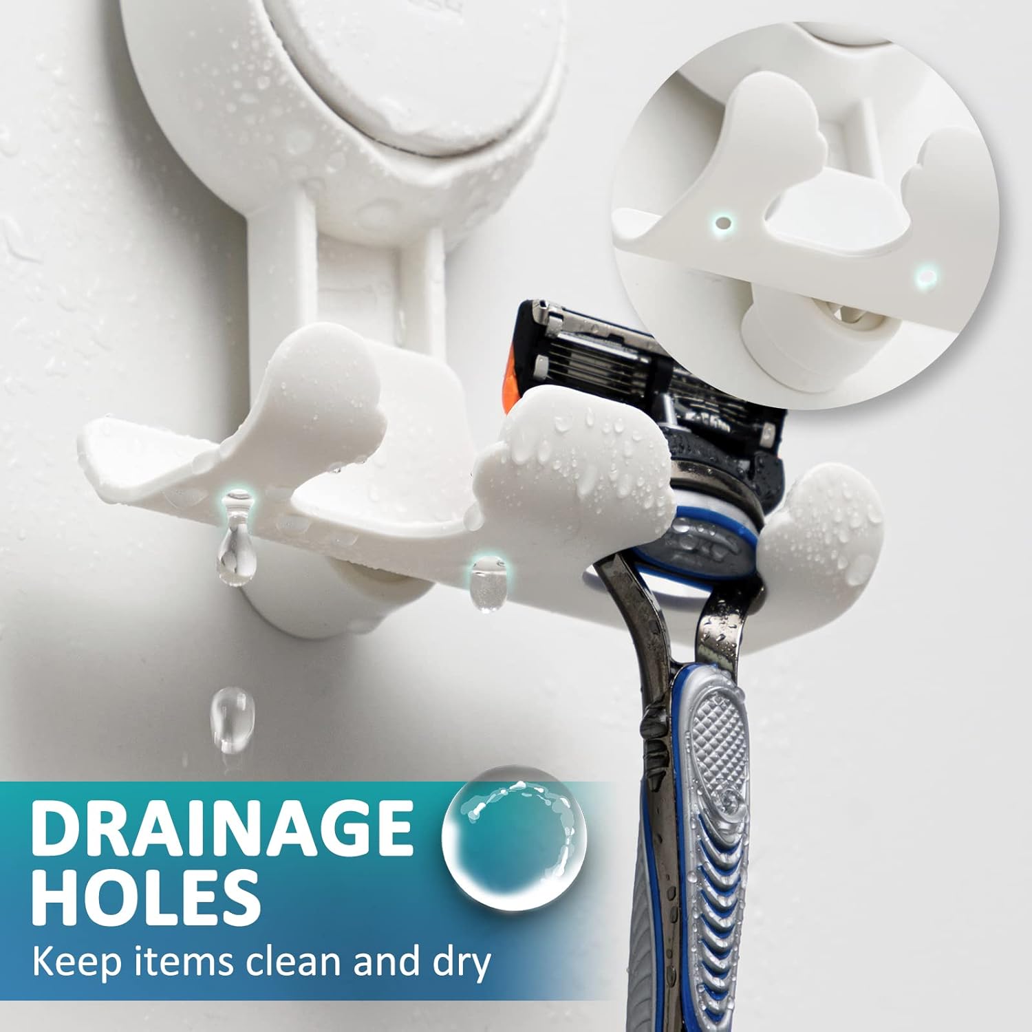- Prevent ponding and keep clean: The vacuum suction cup shower razor hooks fabricates several drainage holes in the bottom, which allows water to flow down easily, preventing ponding, keeping the hooks clean and hygienic