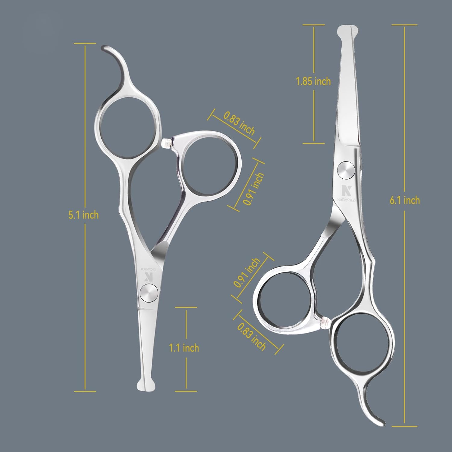 - đĽMULTI-USAGE : Our Hair Cutting Kit includes: 1 pair of 6.1'' hair shears, 1 pair of 5.1'' hair scissors and a hair comb. The 6.1'' Toddler Hair Scissors measure 1.85'' sharp cutting blades, safe and easy to use on toddlers, babies, women and men, or used as dog grooming scissors. The 5.1'' Shears For Hair Cutting measure 1.1'' cutting blades is perfect for mustache, beard, face, ear, eye and nose hair