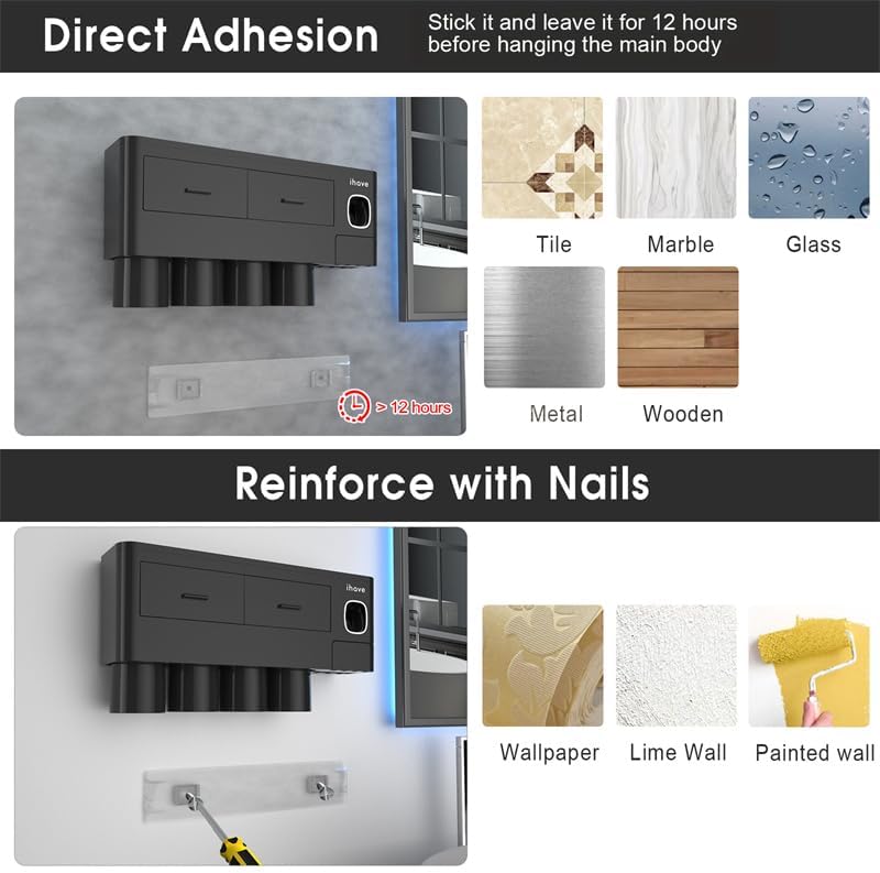 - Sturdy: Our toothbrush holders for bathrooms use a patented non-marking adhesive strip with an excellent caulking effect in humid environments, making it firmly bonded regardless of metal, wood, mirror, ceramic tile, or marble. If the wall is uneven, painted, or wallpaper, we have prepared nails for you to drill and reinforce the mounting. This adaptable design makes it a versatile solution for any home.