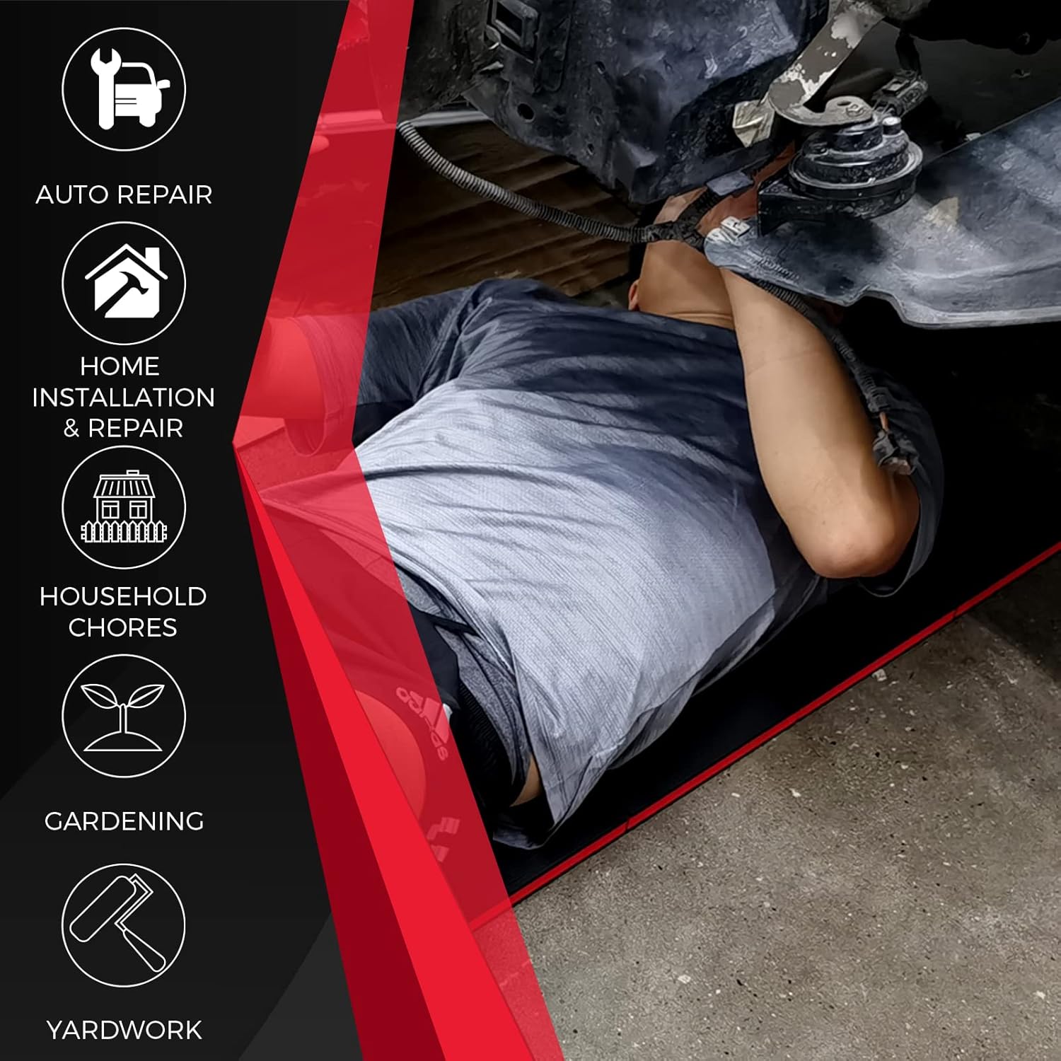 - It can be widely used for all kinds of hard, uneven, cold or dirty surfaces. It is ideal for gardening, jardwork, workshop repairing, home installation and repairing and ect.The 5 fold disign makes it possible to lay comfortable while doing some suspension repairing task.