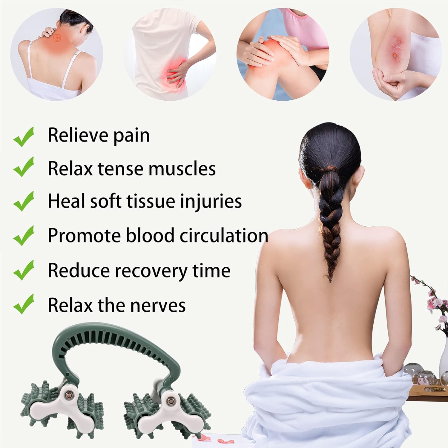 - Full-Body Coverage: With 20 rotating wheels, the cellulite roller covers more area for faster relief. The high-density arrangement ensures no muscle group is missed, from large back muscles to small neck knots. Experience a full-body treatment