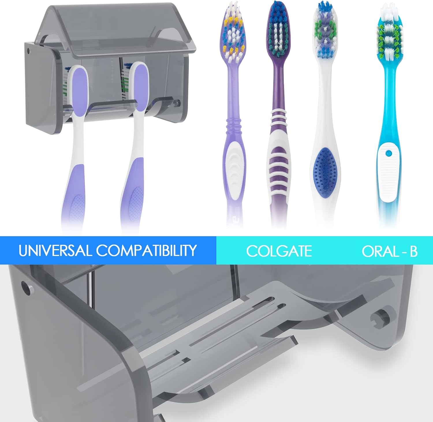 Toothbrush Holder Wall Mounted with Cover for Bathroom, 2 Slots Toothbrush Storage Organizer for Shower, Self Adhesive Toothbrush Hanger Rack for Dorm, Cabinet (Grey)
