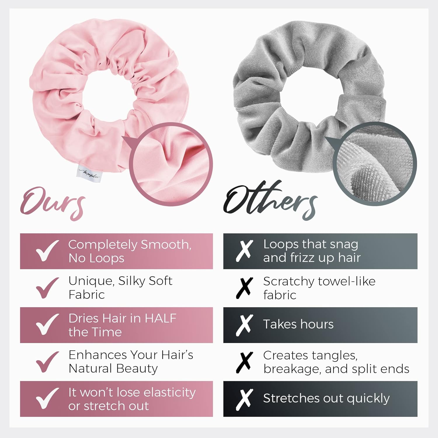 - THE POWER OF RAPID ABSORPTION - Experience the hair-drying miracle! Our silky smooth microfiber scrunchies are like thirsty sponges that gobble up all the extra moisture in seconds, stopping all that messing dripping. Whether youâre straight of the shower, pool, beach, or gym â The Perfect Haircare Towel Drying Scrunchies has you covered!
