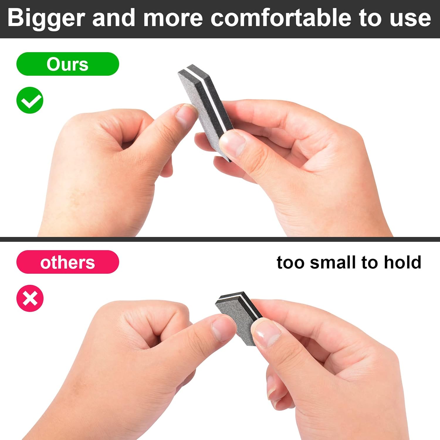 - Middle Size Buffer Block Nail File - The Product Size is 2.36*1.18*0.47inch (6*3*1.2cm), It is a middle size but also portable, easy to organize in your cosmetic bag or purse, allowing you to trim your nails anytime and anywhere, and can be washed and reused without worrying about waste. There are total 30 counts in the package.