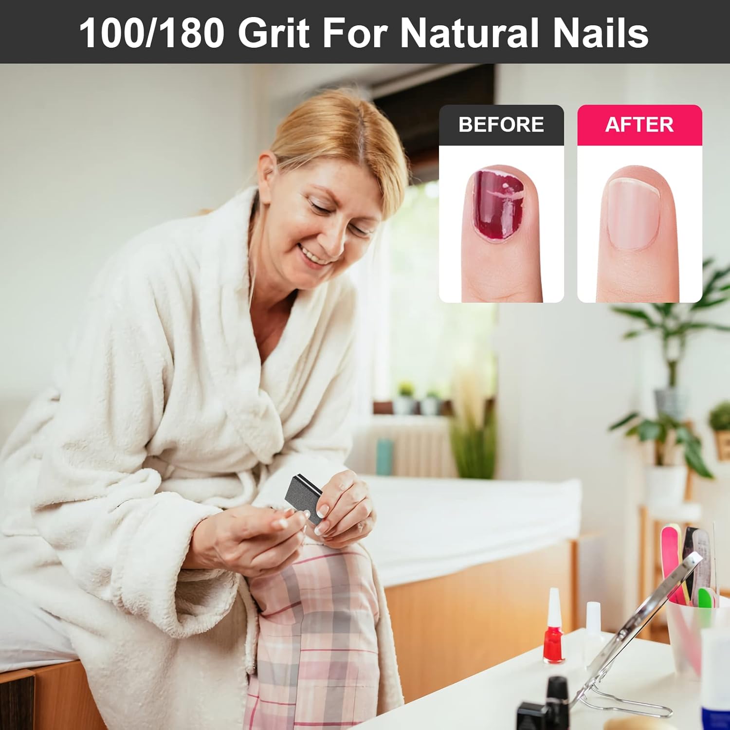 - 100/180 Grit Double Sided Nail Buffers - The most comfortable scrub is 100/180, 100 is used to polish hard nails and toenails, 180 makes their edges smooth, suitable for professional nail shops and home use, They can quickly trim and shape the nails with your desired shape or length. Also they can remove nail gel in your extended or fake nails.