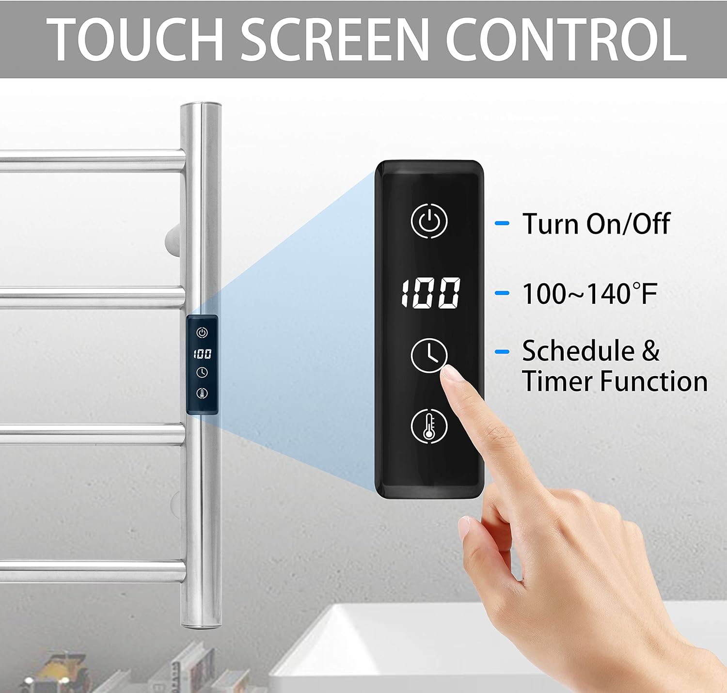 - [TOUGH SCREEN CONTROL]: Manually to turn on/off anytime. Countdown Timer function from 1 hour to 8 hours. Temperature control from 100°F to 140°F.