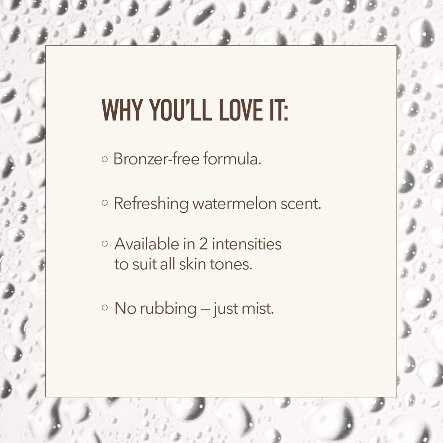 - CLEAN, REFRESHING & STREAK-FREE FINISH: Featuring a lightweight, bronzer-free formula, this alcohol-free tanning mist offers a transfer-free, mess-free experience with a refreshing watermelon scent. Itâs non-comedogenic, non-sticky, and suitable for AM or PM applicationâperfect for layering under or over skin care and makeup without streaking or staining fabrics.
