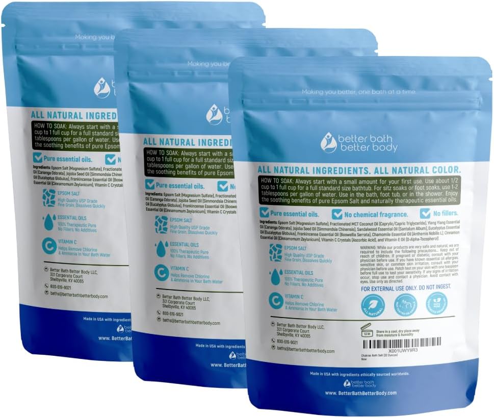 Chakras Bath Salt (3 Pack with Scoop) USP Epsom Salt with Natural Ylang Ylang and Sandalwood Essential Oils Plus Vitamin C in BPA Free Pouch with Easy Press Lock Seal Made in USA Bundle 6 Lbs Total