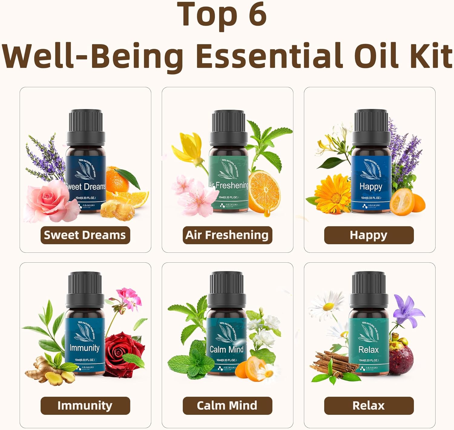 - [Globally Sourced Materials] Introduce the long-lasting, pleasant, and relaxing aroma to your home with our Well-being aromatherapy diffuser oils set! Happy, Calm Mind, Air Freshening, Relax, Immunity, and Sweet Dreams inclued for your well-being and happy life . The scent of plants is effectively preserved using the low boiling point extraction procedure. No carriers, alcohol, or animal testing are used in any of our essential oils