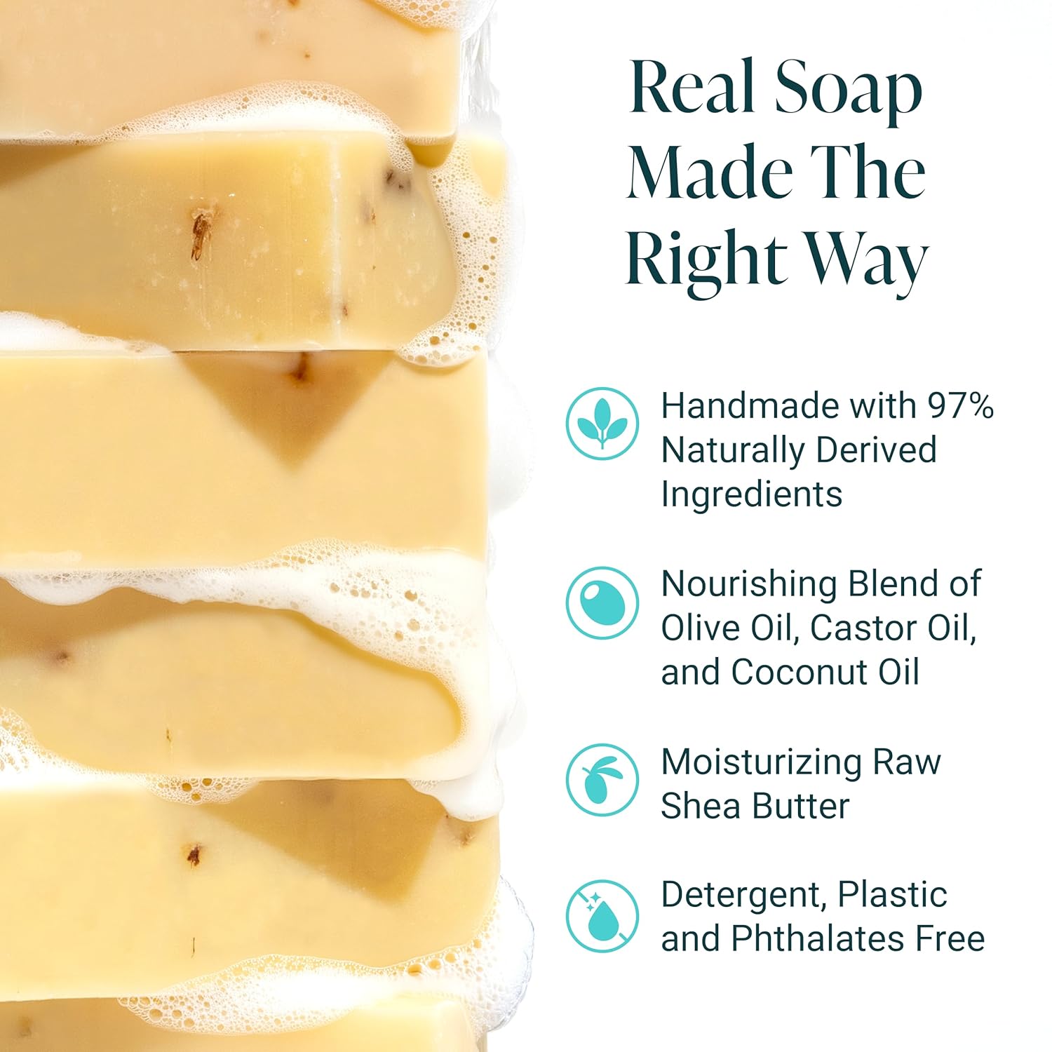 - THE COLD PROCESS DIFFERENCE: Traditional soap is made using the cold-process method, where fats and oils are used to create natural glycerin resulting in true soap (most commercial soaps on the shelves use synthetic ingredients that remove glycerin). The cold process allows all the natural soap goodness to stay intact and enhance our bars with their skin nourishing ingredients (Natural Glycerin, Raw Shea Butter, Natural Oils, Kaolin Clay)