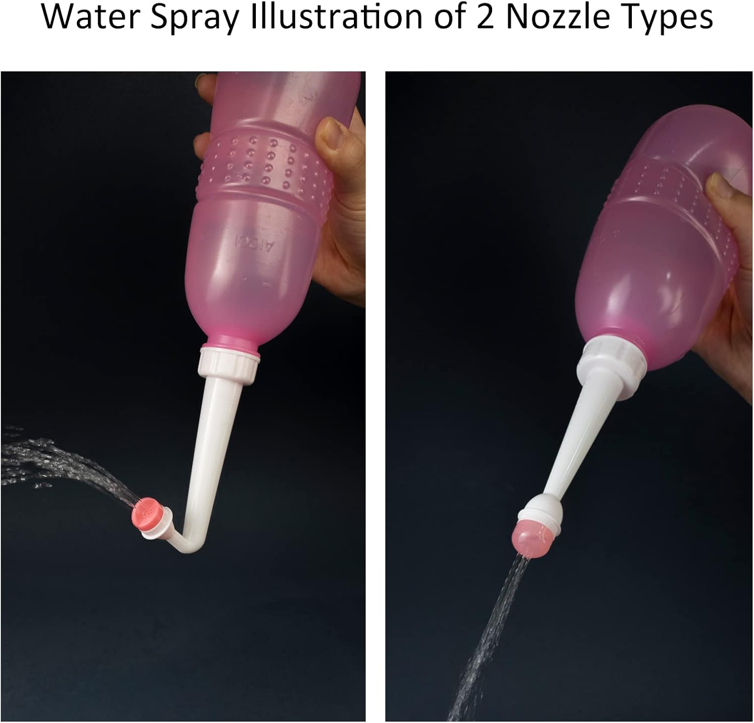 - 2 Nozzle Types that Fulfill Different Cleaning Needs - Please note, for âPack of 1â, the peri bottle comes with only 1 angled nozzle, for âPack of 2â, each peri bottle comes with 1 angled nozzle and 1 straight nozzle. Wide-spraying angled nozzle is more suitable for perineal cleaning with the bottle held upside down and can get perfect aim for hard-to-reach areas, fast-spraying straight nozzle can be used for a quick wash for baby buttocks after pooping.