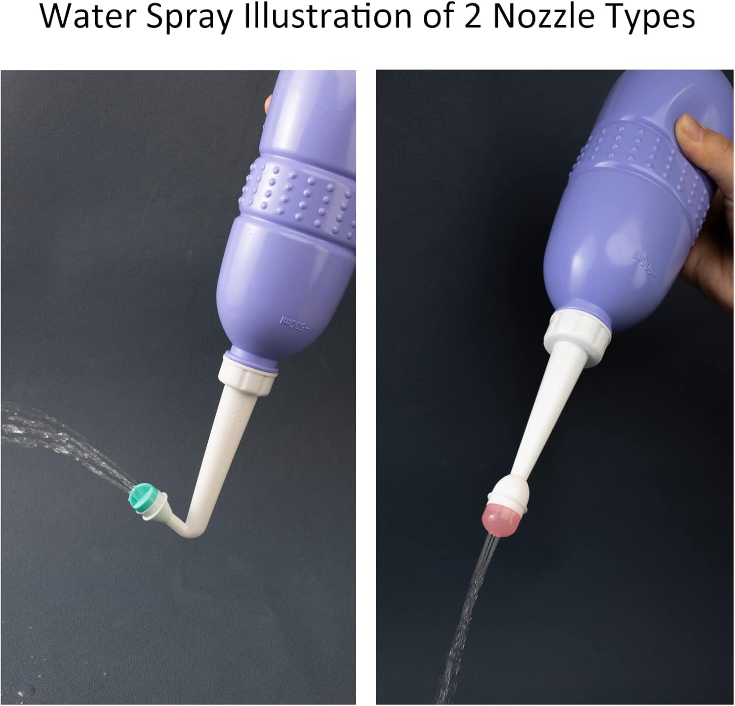 - 2 Nozzle Types that Fulfill Different Cleaning Needs - Please note, for âPack of 1â, the peri bottle comes with only 1 angled nozzle, for âPack of 2â, each peri bottle comes with 1 angled nozzle and 1 straight nozzle. Wide-spraying angled nozzle is more suitable for perineal cleaning with the bottle held upside down and can get perfect aim for hard-to-reach areas, fast-spraying straight nozzle can be used for a quick wash for baby buttocks after pooping.