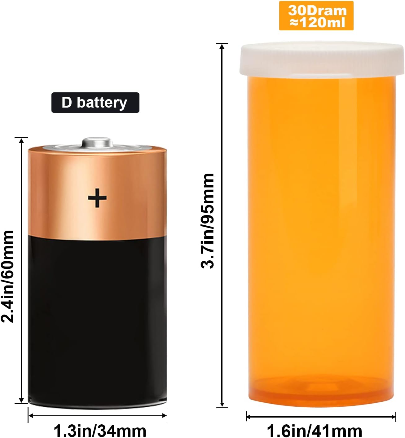 - Perfect Size: Each small plastic prescription vials measures approximately 1.6 x 3.7 inches (41 x 95 mm), 30 dram â 120ml.