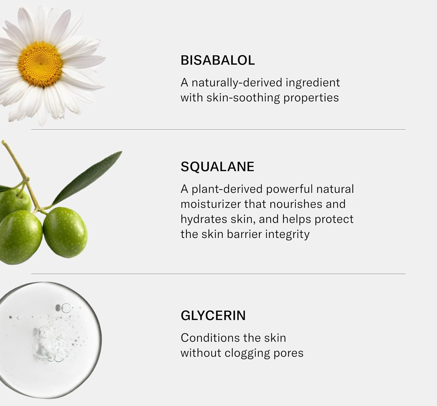 - Hero Ingredients: Bisabalol: A naturally-derived ingredient with skin-soothing properties. Squalane: A plant-derived powerful natural moisturizer that nourishes and hydrates skin, and helps protect the skin barrier integrity Glycerin: Conditions the skin without clogging pores.
