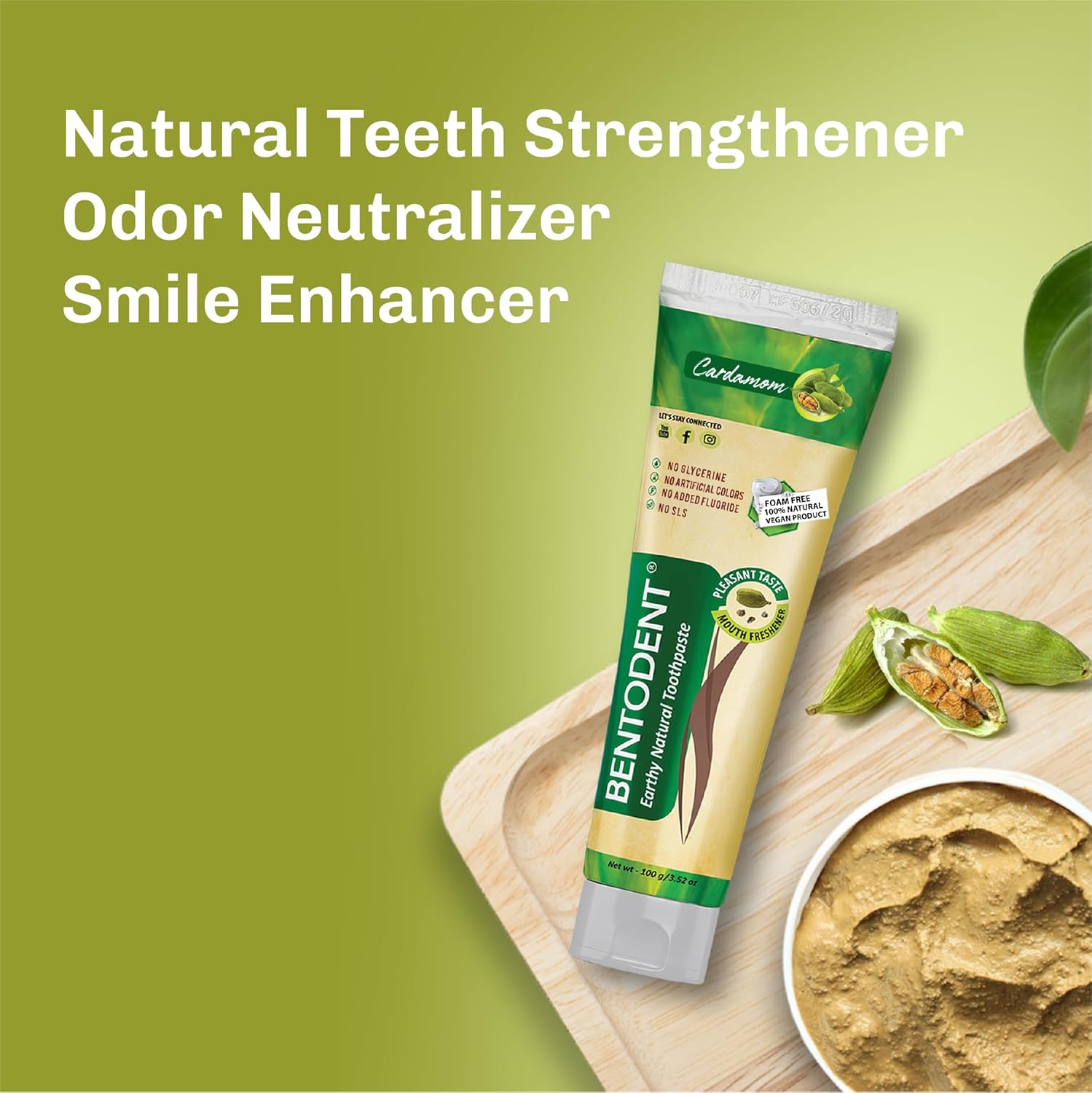 BENTODENT Fluoride Free Remineralizing Calcium Bentonite Clay Toothpaste - Cardamom Flavor Natural Toothpaste, Mint-Free, 3.52 oz - Ideal for Sensitive Teeth & Whitening with Toothbrush