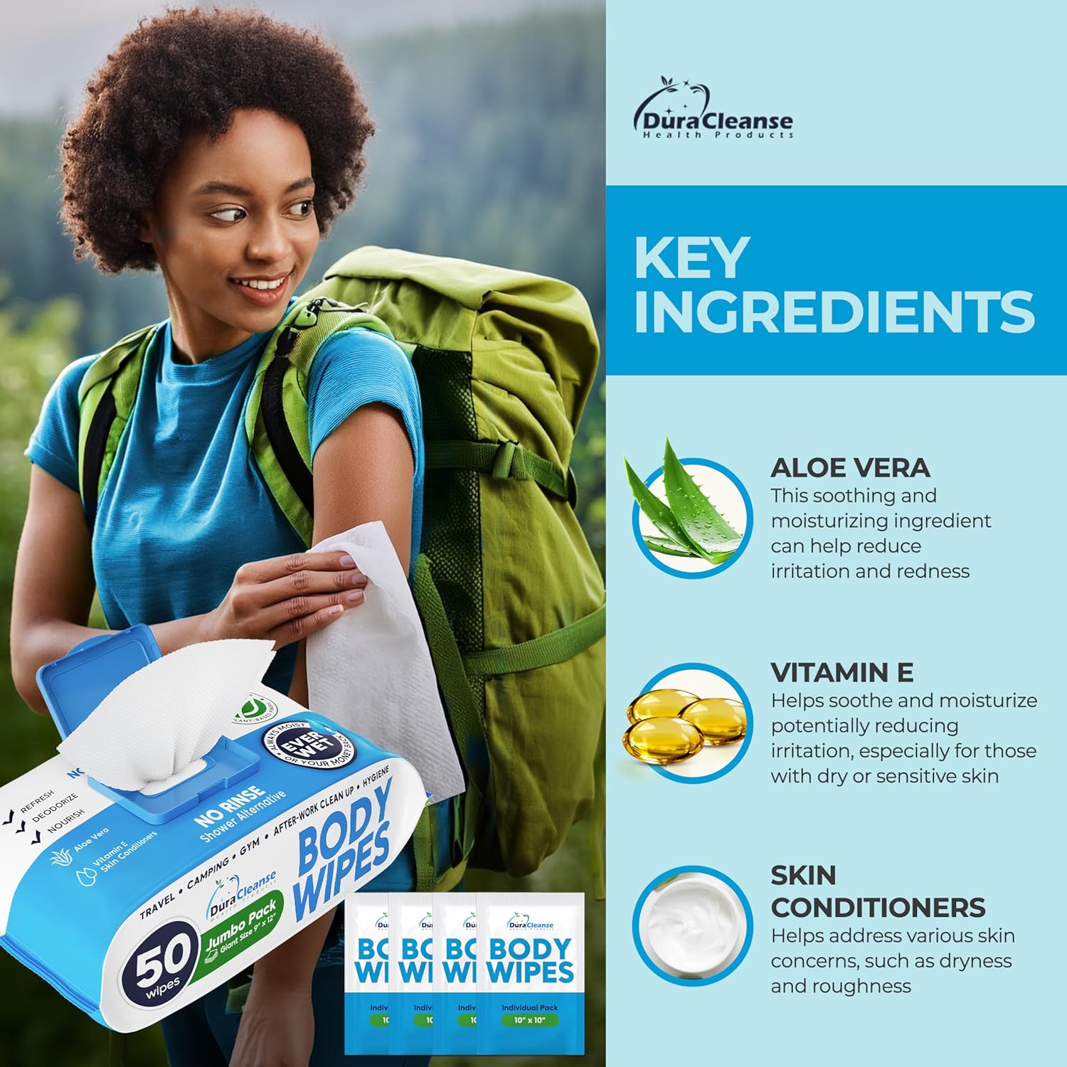 XL Body Wipes for Adults Bathing No Rinse - 50 Ct. + 4 Travel Shower Wipes - 9"x12" Thick Cleansing Bath Wash Sheets for Elderly Incontinence, Men & Women - Camping Essentials Disposable Washcloths