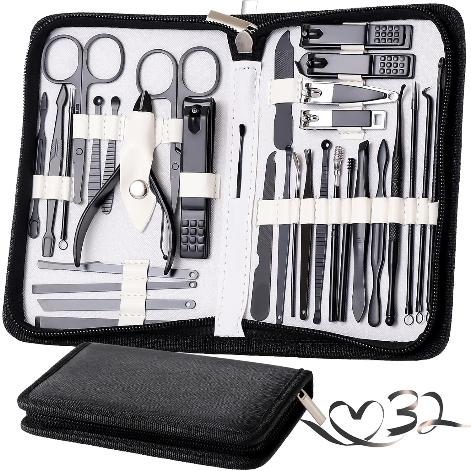 Manicure Set Pedicure Kit Womens Nail Clippers Set 32 in 1 Professional Grooming Care Tools Nail Kit Including Facial, Fingernails and Toenails Care with Travel Case Women (White/Black_32 in 1)