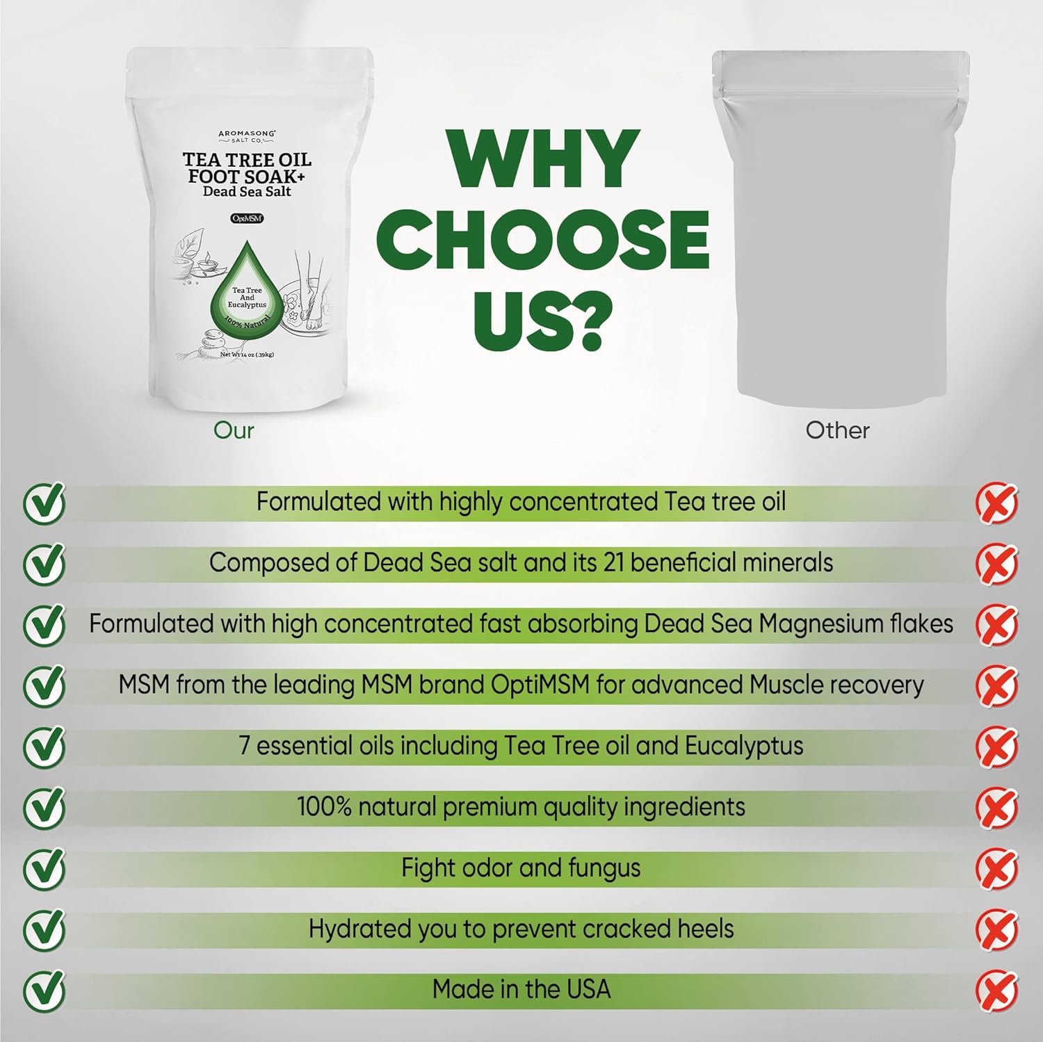 - đŁ Aromasongâs Foot Soak: Our Natural foot bath salt is Formulated with Magnesium Flakes, Dead Sea Salt and its 21 Minerals that soothes tired, achy Feet. Couple that with Tea Tree Oil and all the benefits of the 7 essential oils, fast absorbing dead sea magnesium flakes, and OptiMSM. A 20-minute foot care soak of Aromasongâs Tea Tree Foot Soak will give your feet a daily pampering in the comfort of your own home.