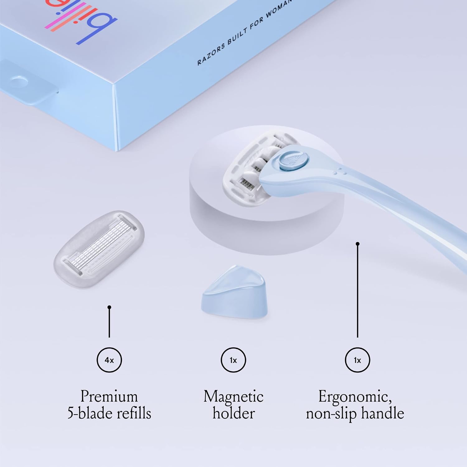 Billie Razors for Women Shave Kit – Women’s Razor + 4 x 5-Blade Razor Refills + Magnetic Holder – Cool Blue