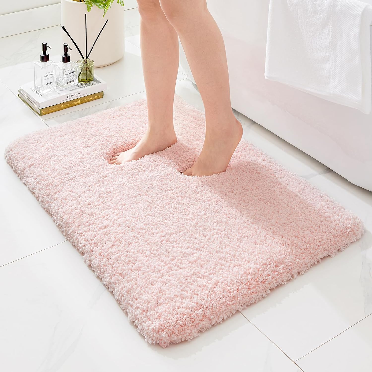 - Luxurious Touch and Aesthetic Design:this high plush bathroom rugs features 1.8-inch fluffy pile that feels so soft and delicate,providing an ultimate comfortable experience.its elegant design and rich color options (such as pink,white, blue, gray) can easily blend into various home styles,adding a touch of luxury and fashion to your bathroom