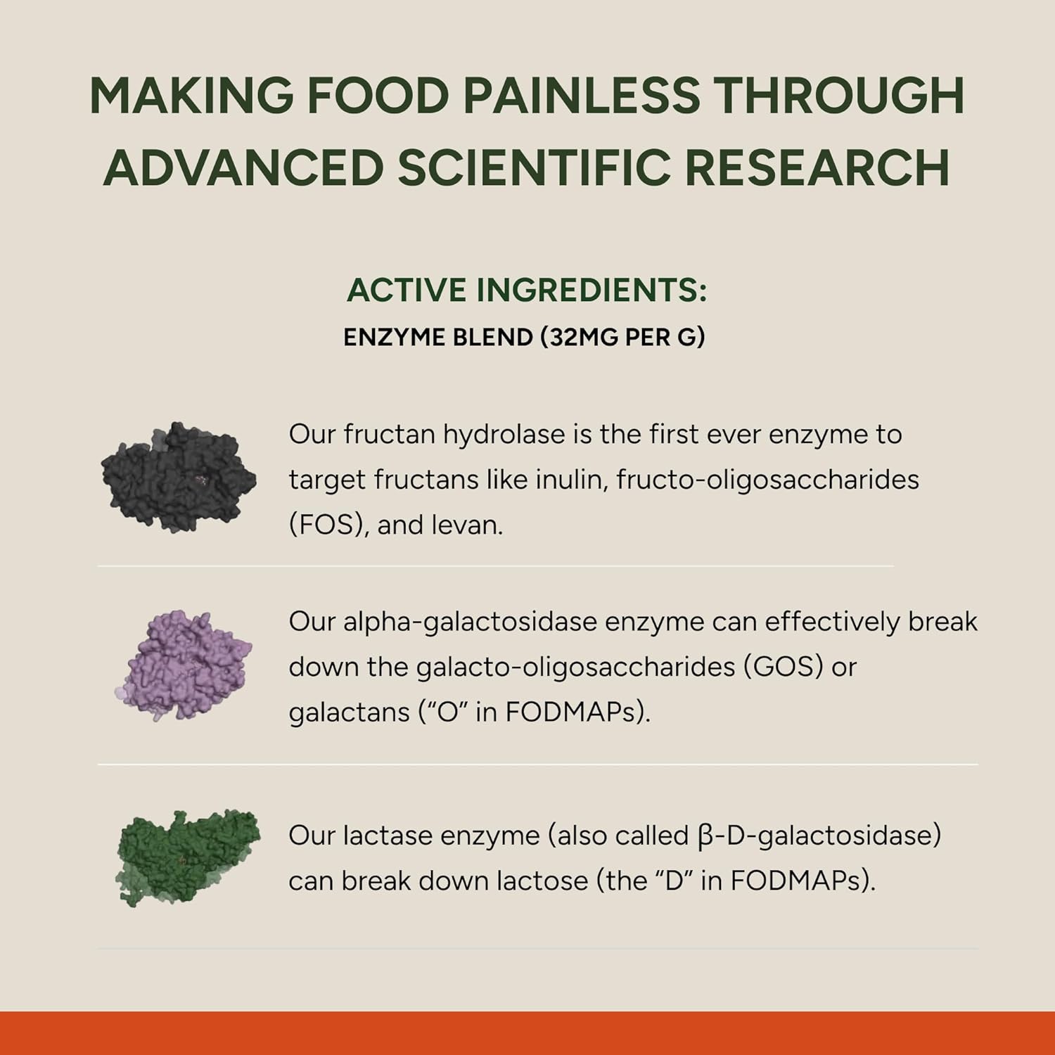 - SCIENTIFICALLY PROVEN: Tested and validated in scientific studies, our product is published in peer-reviewed journals for its effectiveness. Created by Harvard graduates, our special blend of natural digestive enzymes targets common gut issues from FODMAPs, including lactose, galacto-oligosaccharides (GOS), and fructans.