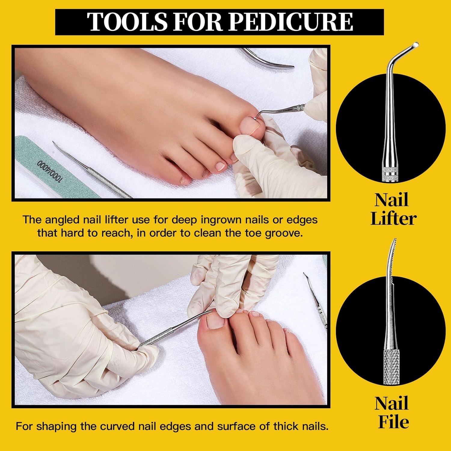 - Nail Lifter & Double Sided Nail File In Ingrown Toenail Tool: The nail lifter is equipped with the angled heads. It can lift the nail corners to reach nail edge easily and remove the stubborn debris effortlessly. It helps to get rid of the pain and discomfort caused by ingrown toenails. The stainless steel nail file consists of a straight end for filing the outer flat surface of the nails and a curved end for trimming the curved surface, nail edge and nail corners.