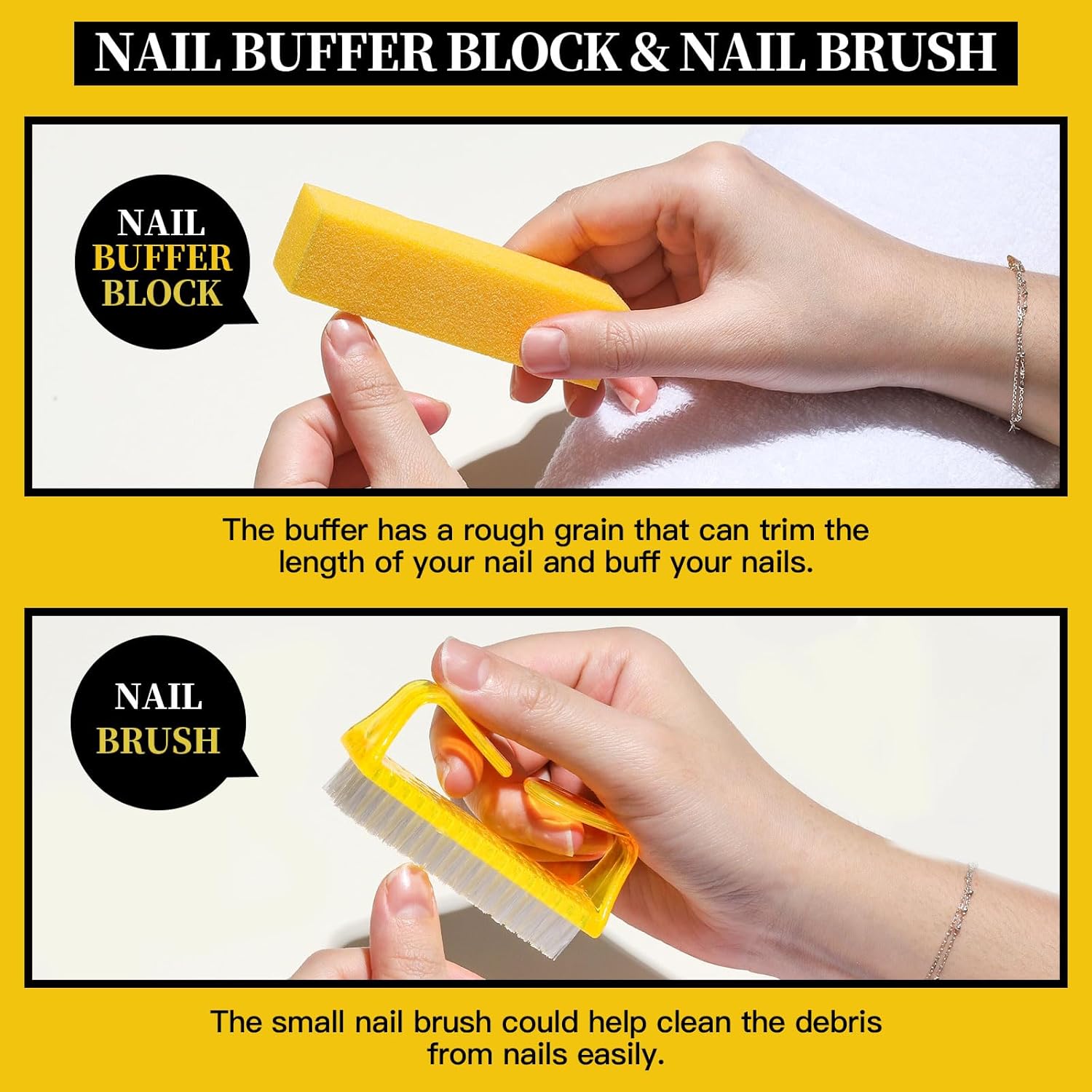 - Practical Nail Care Kit For Filing & Polishing: The nail files 100/180 grit are coarse-grained, suitable for removing nail gel or nail polish, also for toenails. For accurate filing on the edges of the nail and trimming the shapes and length according to your needs. The buffer and polishing files are suitable for polishing uneven nail surface to make your nails smooth and shiny. The small nail brush can help to easily brush the residue off the nails.