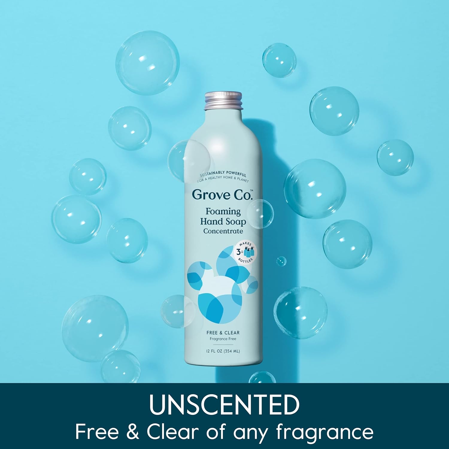 - HAND WASH & DISPENSER SET: Keep your hands feeling clean and soft with this Grove Co. bundle that includes one Free and Clear Foaming Hand Soap Refill, a Glass Soap Dispenser, and a Silicone Sleeve. A durable home starter kit or housewarming gift