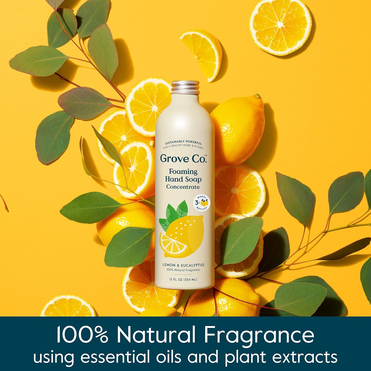 - HAND WASH & DISPENSER SET: Keep your hands feeling clean and soft with this Grove Co. bundle that includes one Lemon and Eucalyptus Foaming Hand Soap Refill, a Glass Soap Dispenser, and a Silicone Sleeve. A durable home starter kit or housewarming gift