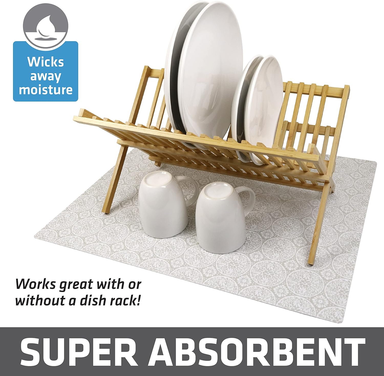 - PROTECTS COUNTERTOPS FROM SCRATCHES, SCUFFS, AND SPILLS: Our mat protects your counters by providing a protection layer when placed under a dish rack, pots, pans, dishware, and glassware. It also protects under small appliances such as a mixer, blender, or coffee maker.