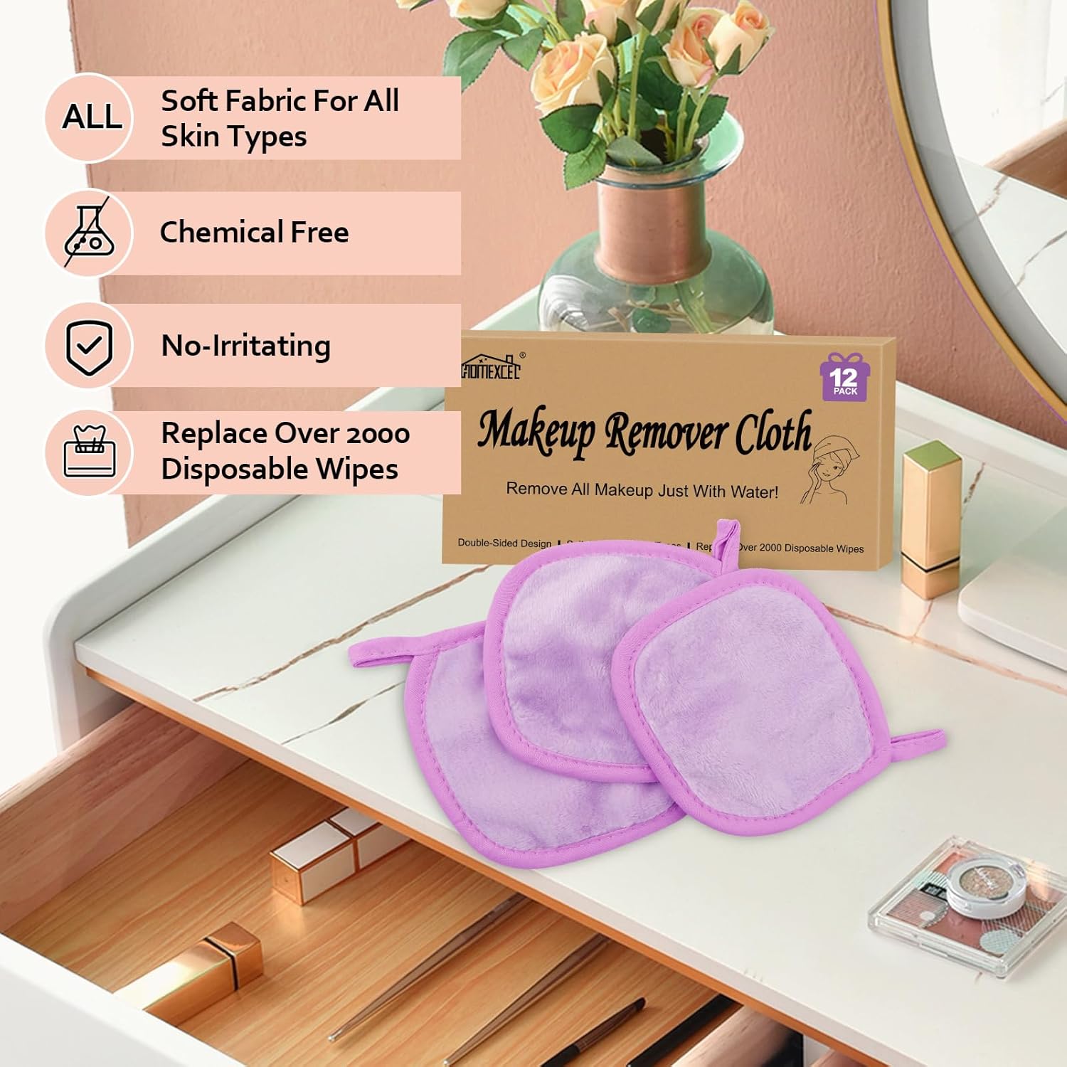 HOMEXCEL Makeup Remover Cloth 12 Count (Pack of 1), Reusable Makeup Remover Pads, Washable Ultra Soft Facial Cleansing Cloths For All Skin Types, 5 X 5 In, Purple