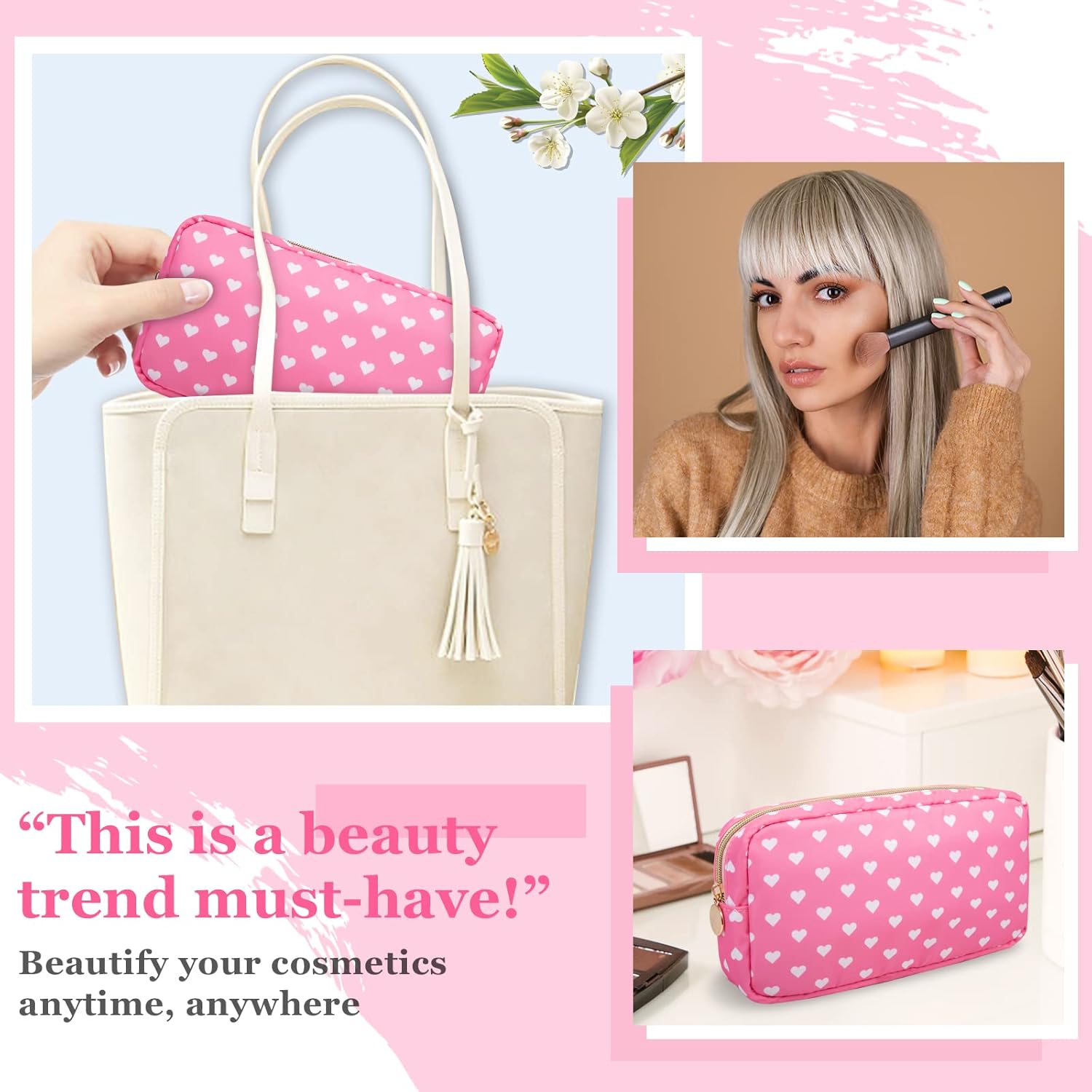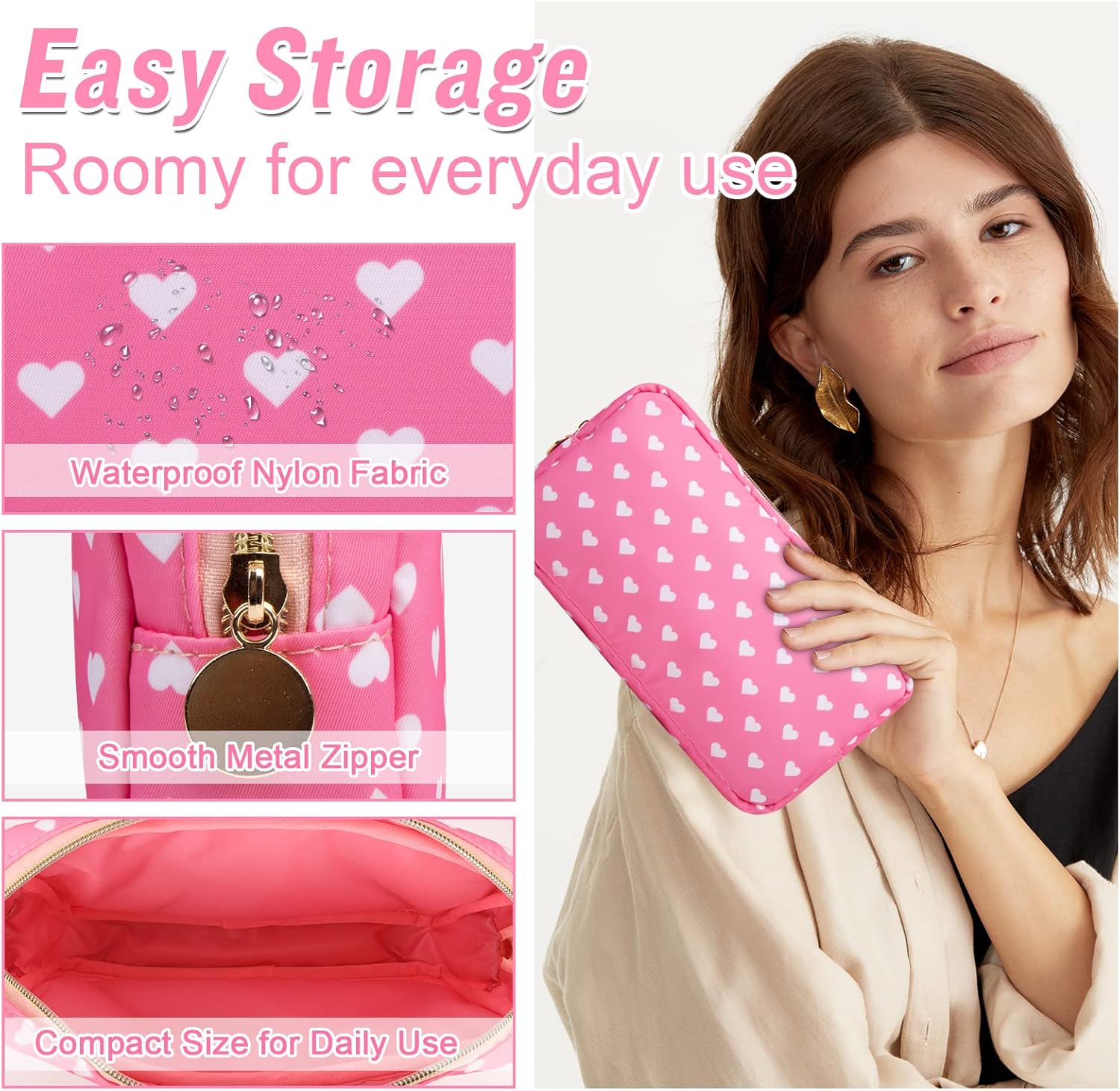 - ❤【Multiple Sizes & Colors】Large, Small, Mini, or Slim, we have it all! Cosmetic bag has a variety of patterns to choose from: pink hearts, black houndstooth, black and white grids, pink and blue grids for you to choose. Nylon makeup bag for purse can be used for travel, outdoors and organization, it can be used as a coin pouch, purse bag, travel pouch, clutch and more.