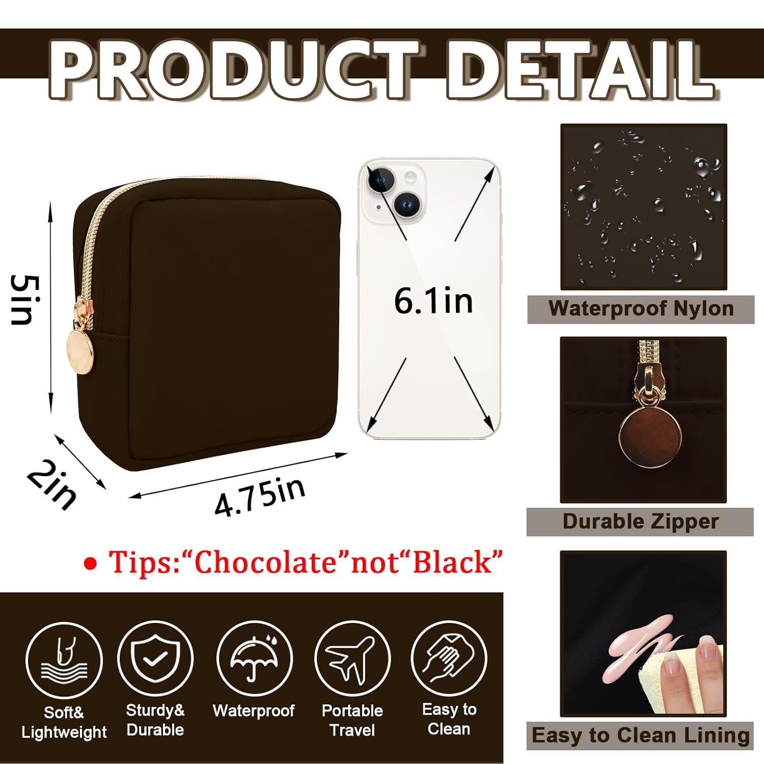 Mini Makeup Pouch for Purse, Small Cosmetic Bag Pouch Nylon Travel Toiletry Organizers Bag for Women Girls, Cute Zipper Coin Purse Preppy Storage Purse for School Work(Mini-Chocolate)