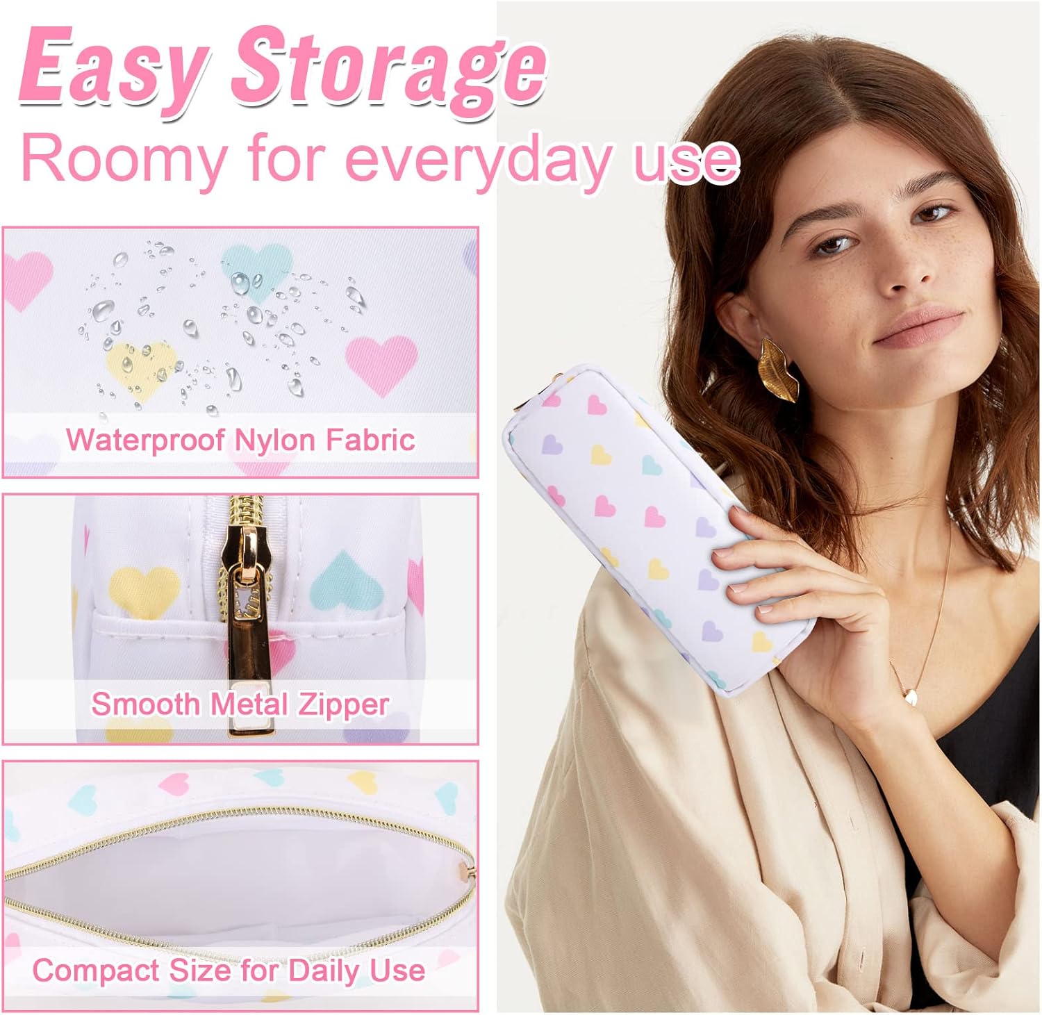 Nylon Small Makeup Bag, Slim Pink Makeup Brush Case, Preppy Cosmetic Zipper Pouch for Purse, Travel Toiletry Bag Clutch Coin Pouch Makeup Organizer for Women Girls (White Heart)
