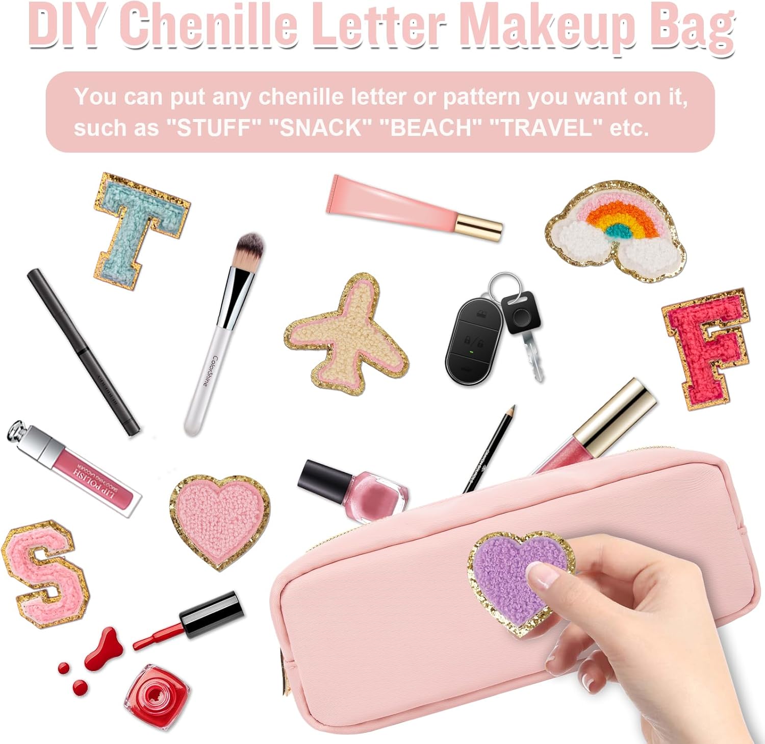 - ❤【DIY Your Bag & Patches Friendly】Slim compact makeup bag material allows you to easily attach your favorite patches and fits all travel toiletries. You can put any chenille letters or patterns you want on it, "STUFF" SNACK "BEACH" and so on to design your unique travel makeup bag. Make your preppy makeup bag very interesting and vivid!