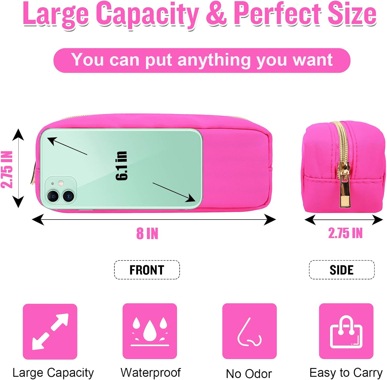 - ❤【DIY Your Bag & Patches Friendly】Slim compact makeup bag material allows you to easily attach your favorite patches and fits all travel toiletries. You can put any chenille letters or patterns you want on it, "STUFF" SNACK "BEACH" and so on to design your unique travel makeup bag. Make your preppy makeup bag very interesting and vivid!