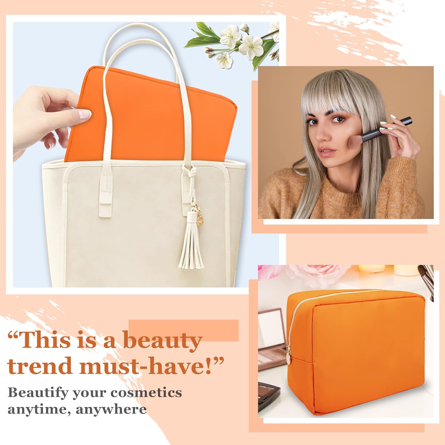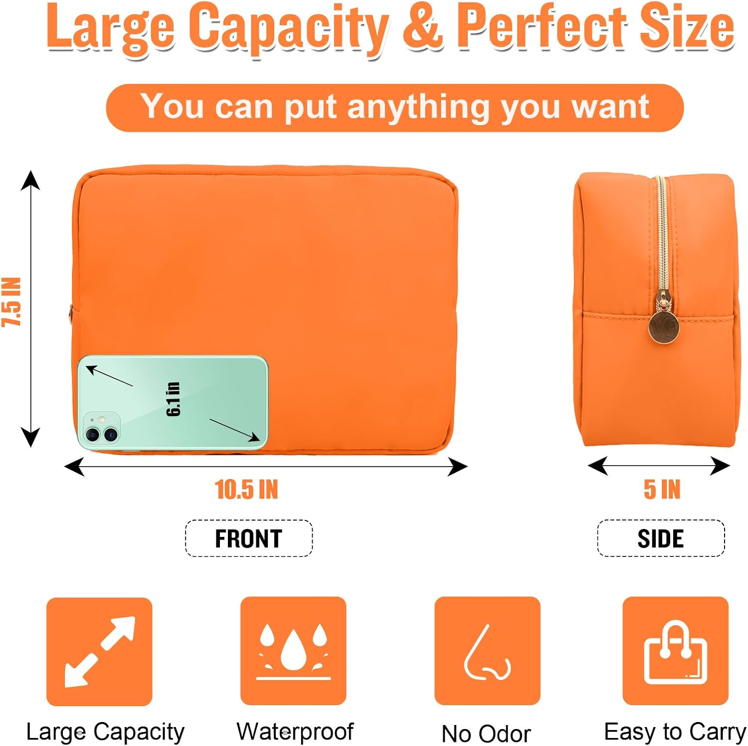 Nylon Large Makeup Bag Travel Cosmetic Bag Pouch, Preppy Big Makeup Bag Cute Cosmetic Zipper Pouch Purse, Waterproof Toiletry Bag Clutch Makeup Organizer Travel Essentials for Women Men Girls(Orange)
